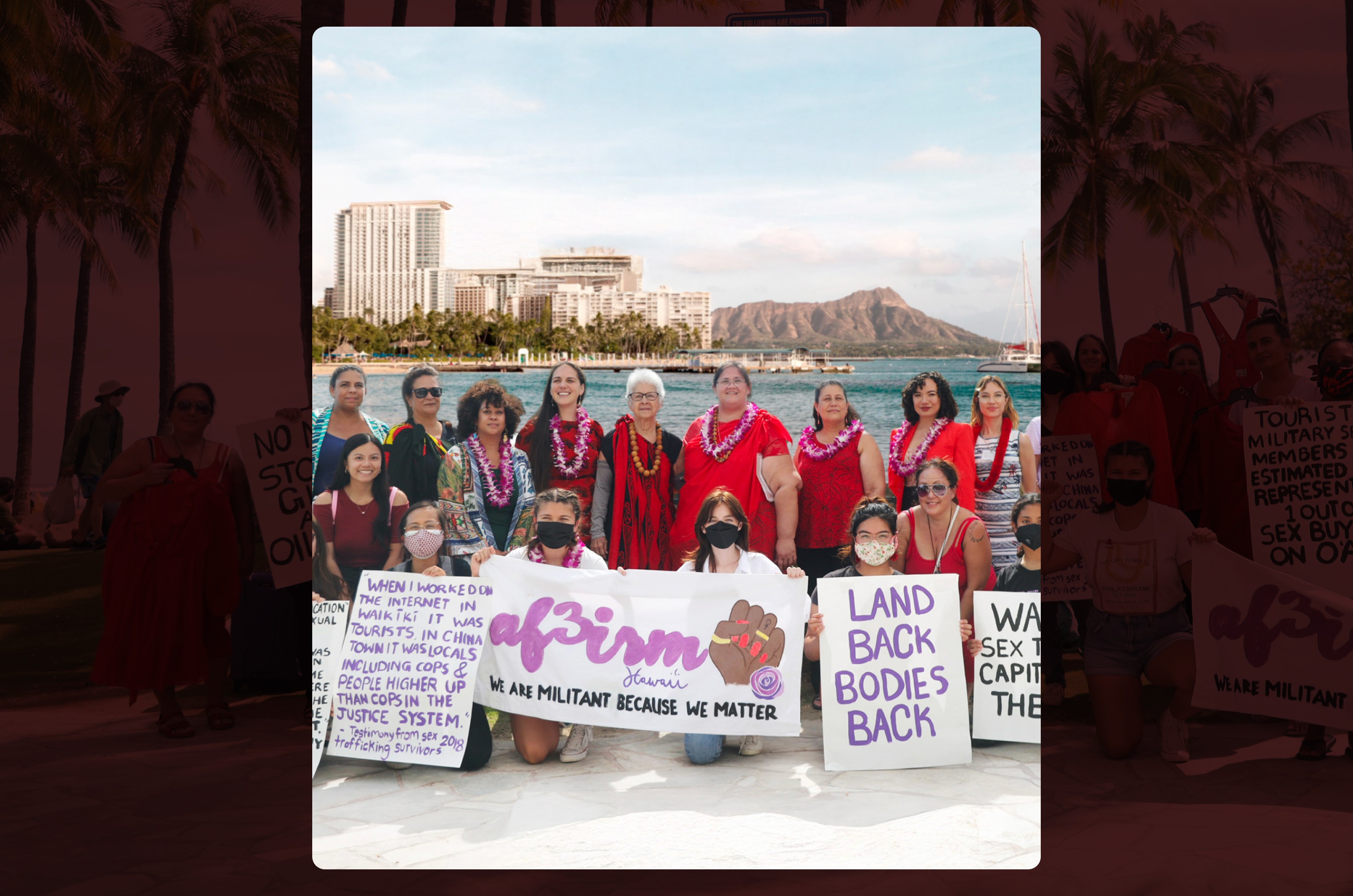 The final cover combined protest imagery with Diamond Head in the background. Human faces made it personal. Diamond Head grounded it geographically because this is Hawaiʻi-specific violence requiring Hawaiʻi-specific action. The protest signs communicated urgency immediately: even before opening the report, you understand this is about systemic violence and demands for change.