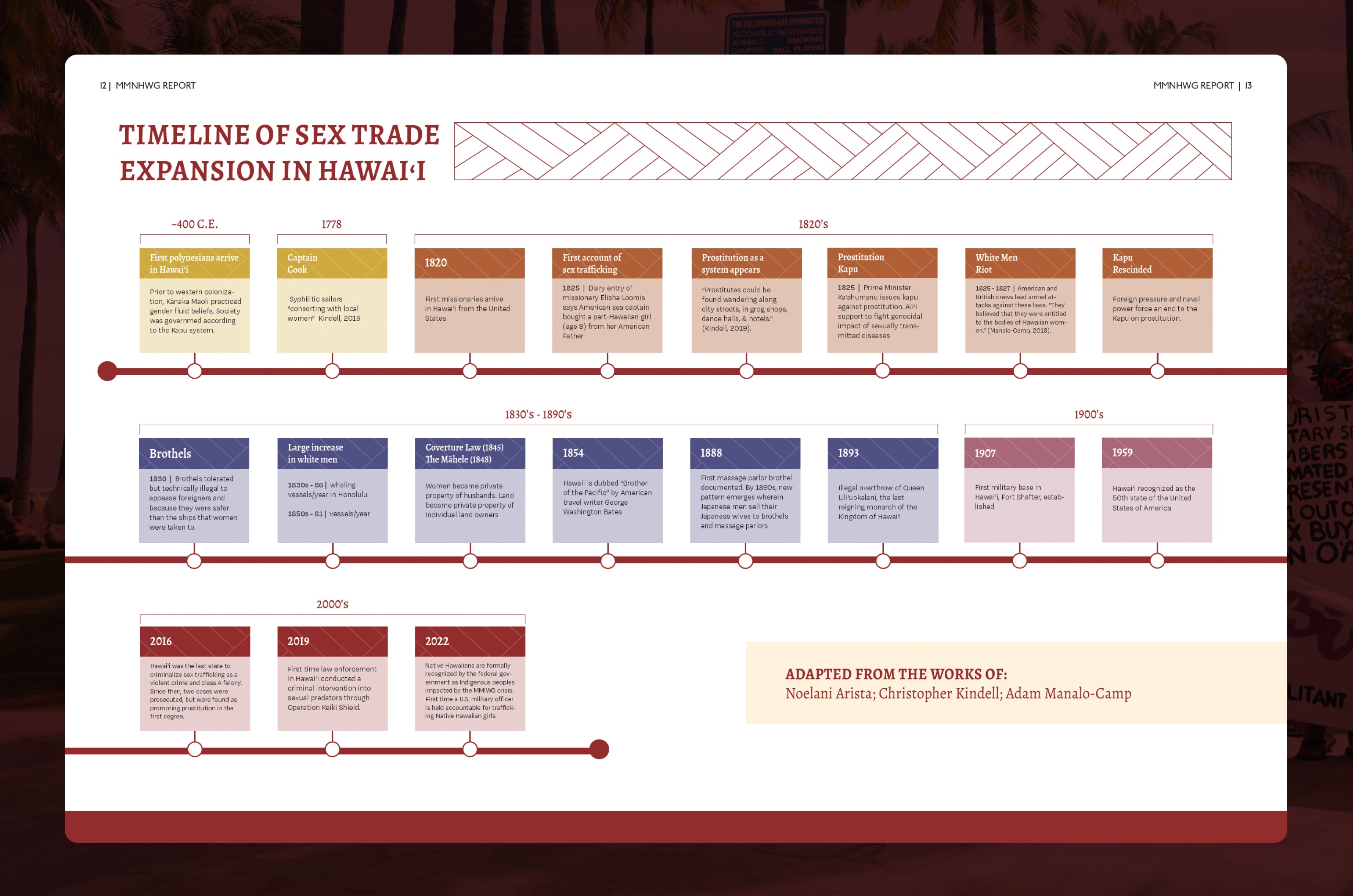 The timeline documented 19 critical moments from 400 CE to 2022: the expansion of sex trade in Hawaiʻi, colonial impact, and systemic failures that created conditions for murdered and missing Native Hawaiian women and girls.