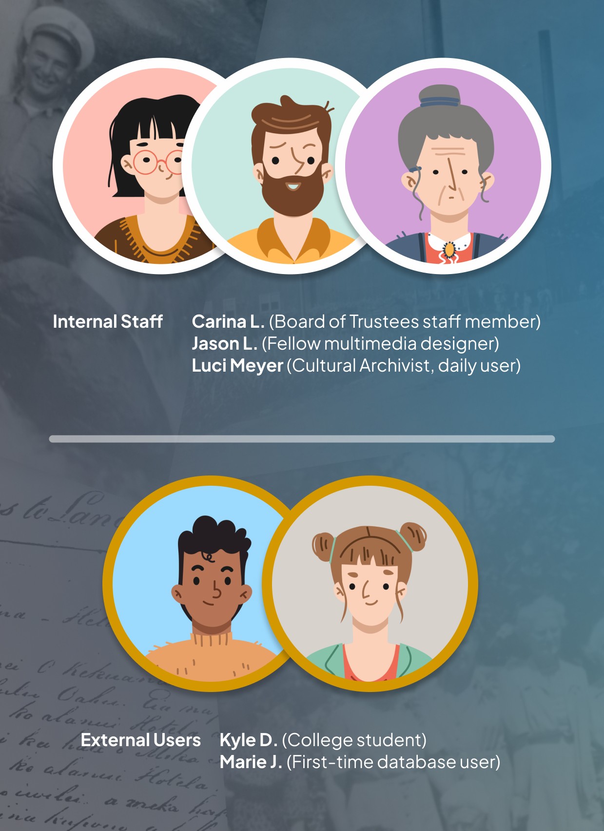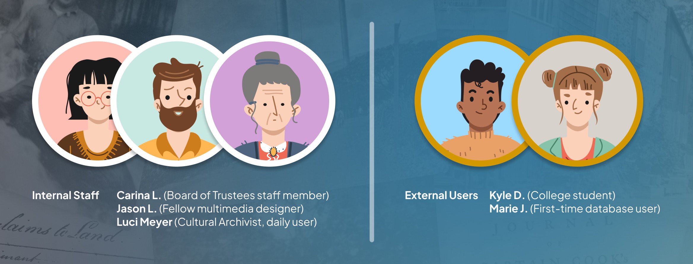 Internal staff (3 people): Luci Meyer (Cultural Archivist, daily user), fellow multimedia designer, OHA Board of Trustees staff member