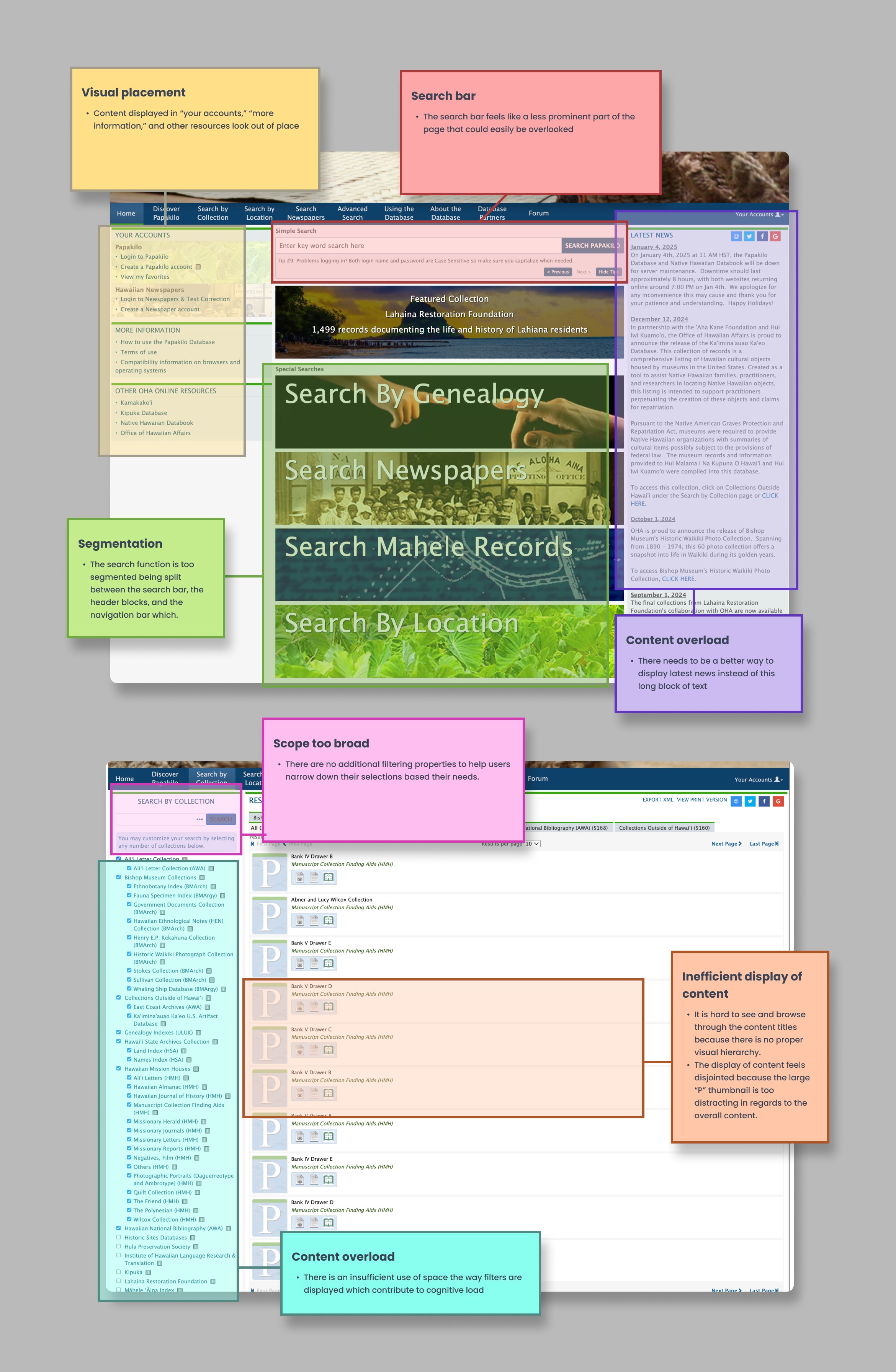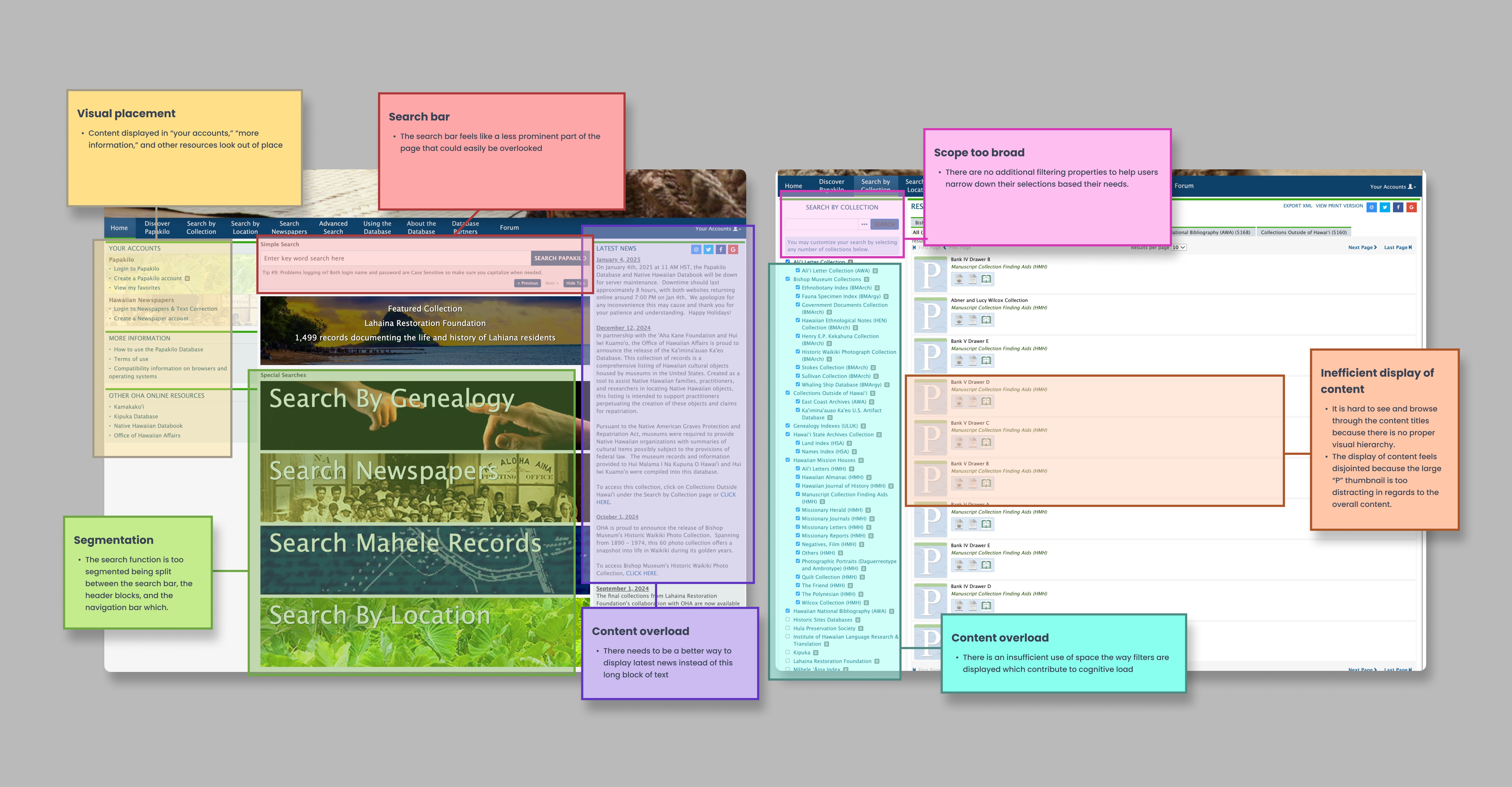 Identified a critical usability problem: Research with internal staff and external users confirmed that Papakilo's fragmented search experience created real barriers to accessing nearly 1 million cultural records. The cultural archivist's struggle wasn't isolated—it represented a systemic problem.
